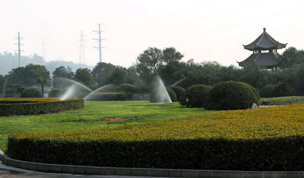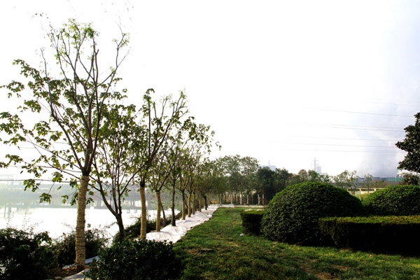 图一:为构建一条公司及周边区域的绿色屏障,伟德体育公司在东门套湖周边移植杨柳、广玉兰等花木,并对损坏草坪进行养护、修复。
