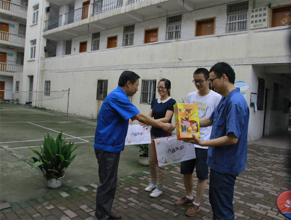 伟德体育公司党委副书记、工会主席吴健为外地单身青工赠送月饼和体育用品(陈沐 摄)