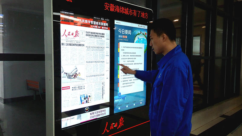 日前,一台《人民日报》电子阅报栏落地伟德体育公司弘毅楼食堂内,吸引该公司员工们点击阅读。