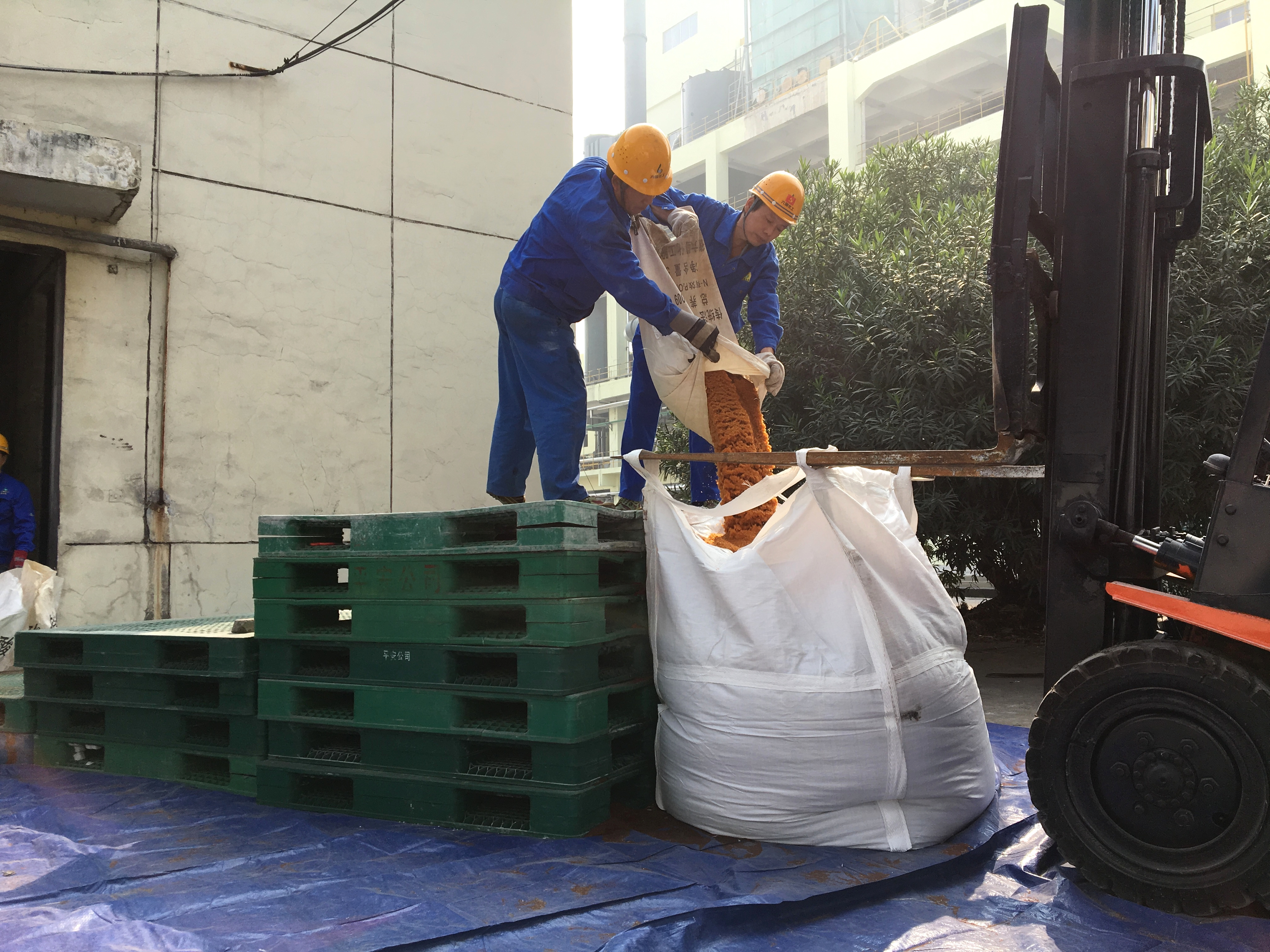 检验中心员工将收集的磷酸分析废液返回生产系统循环利用。