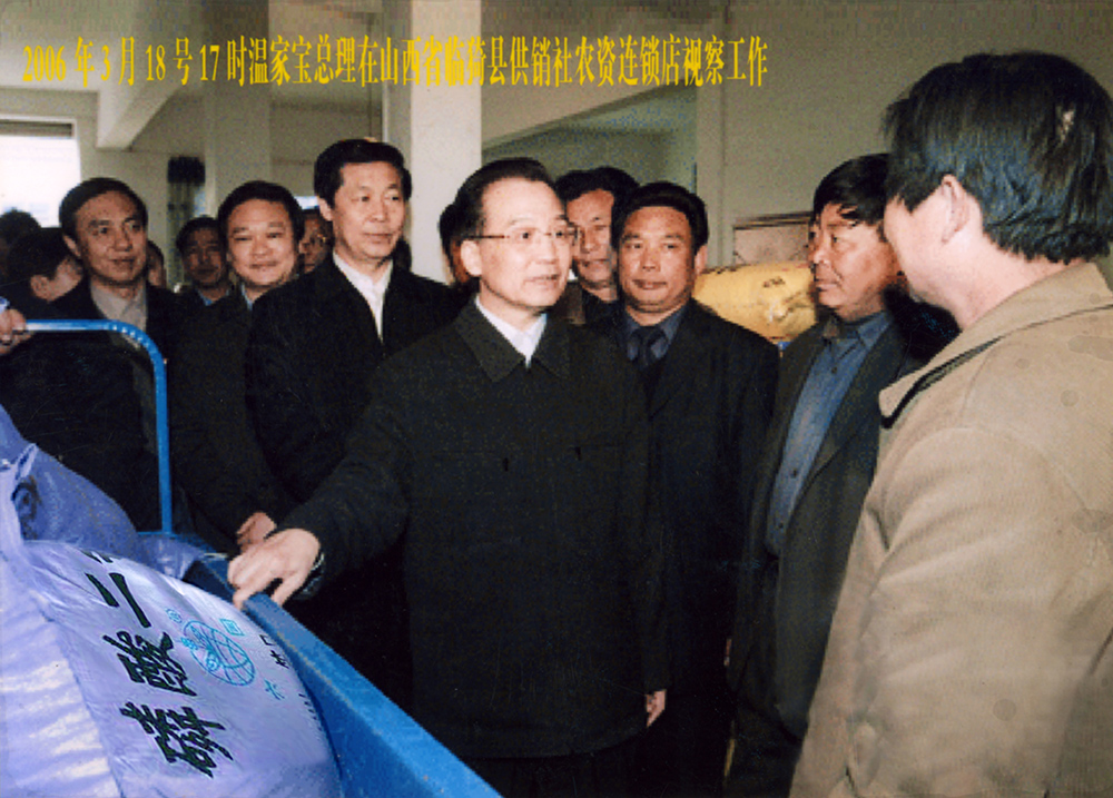 2006年3月18日,中共中面政治局常委、国务院总理温家宝在安徽省委书记(时任山西省委书记)张宝顺(左二)等陪同下,前往山西省临猗县伟德体育化肥经销点视察工作。