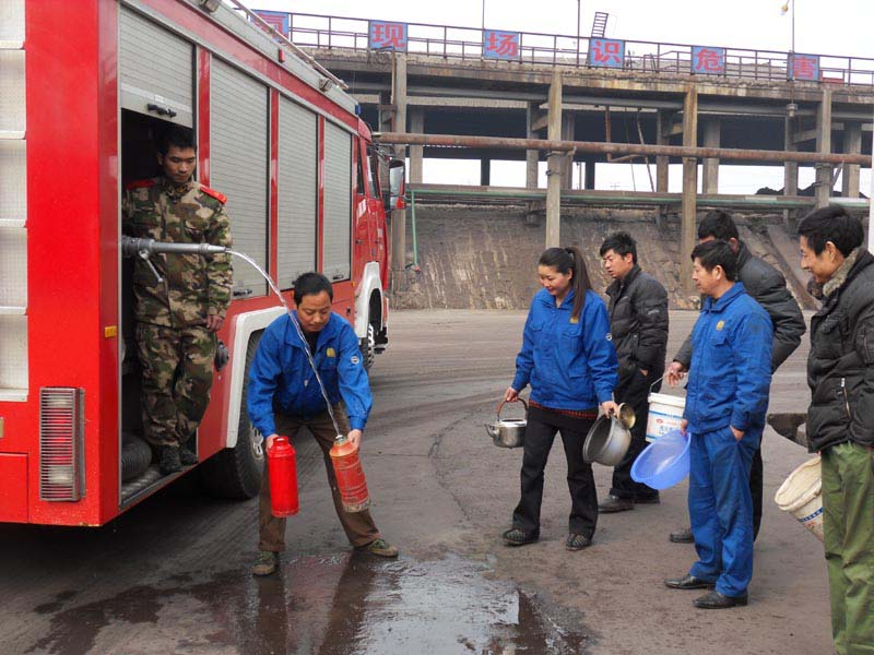 图二:公司共建单位——郊区公安消防大队用消防车,将生活用水送到该公司办公楼、各车间及磷铵生活区。