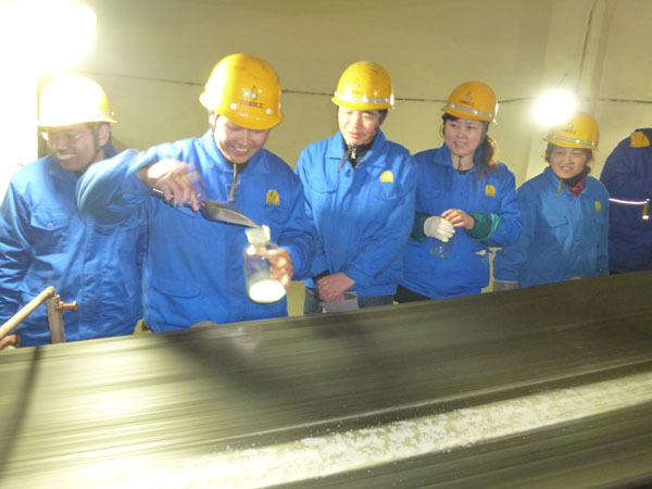 该装置采用目前国内比较成熟的二氧化碳气提工艺。2月16日下午,二氧化碳气体及液氨先后进入尿素生产系统,随后解吸水解、蒸发系统相继投入运行。DCS主控人员与现场操作人员密切配合,实时监控操作画面,精心调节液位和流量等工艺参数,将各工艺指标控制在正常范围内。高压圈及分解循环系统运行约2小时后,蒸发造粒系统运行,经过造粒喷头高速旋转。当日19时42分,首批白色成品尿素成功产出,工艺流程全线打通,尿素产品成功下线。
